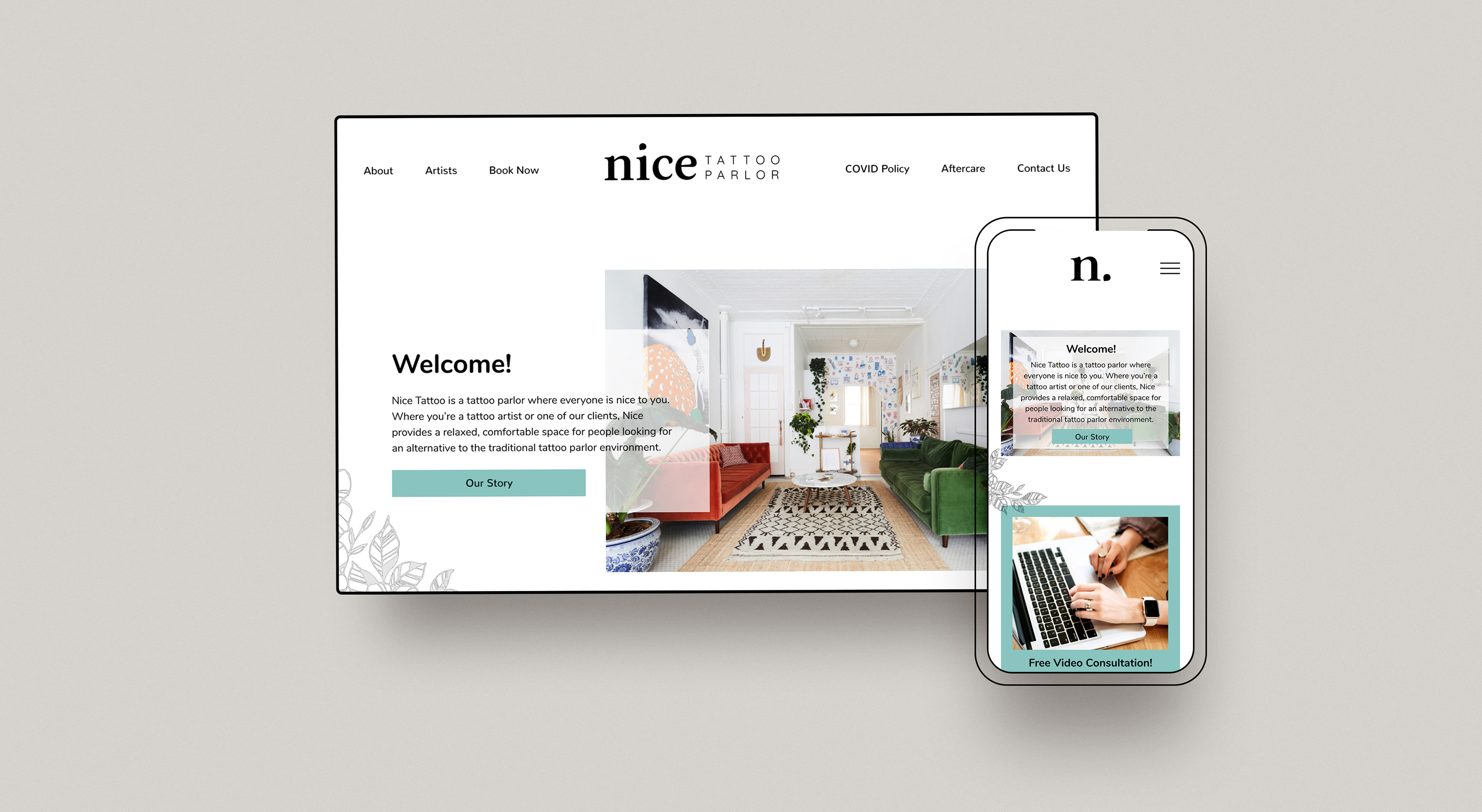 When designing the mood board, I kept a few keywords in mind - inviting, vibrant, calm, accessible. I wanted to stay true to what their brand mission is: A tattoo shop where everyone is nice to you.