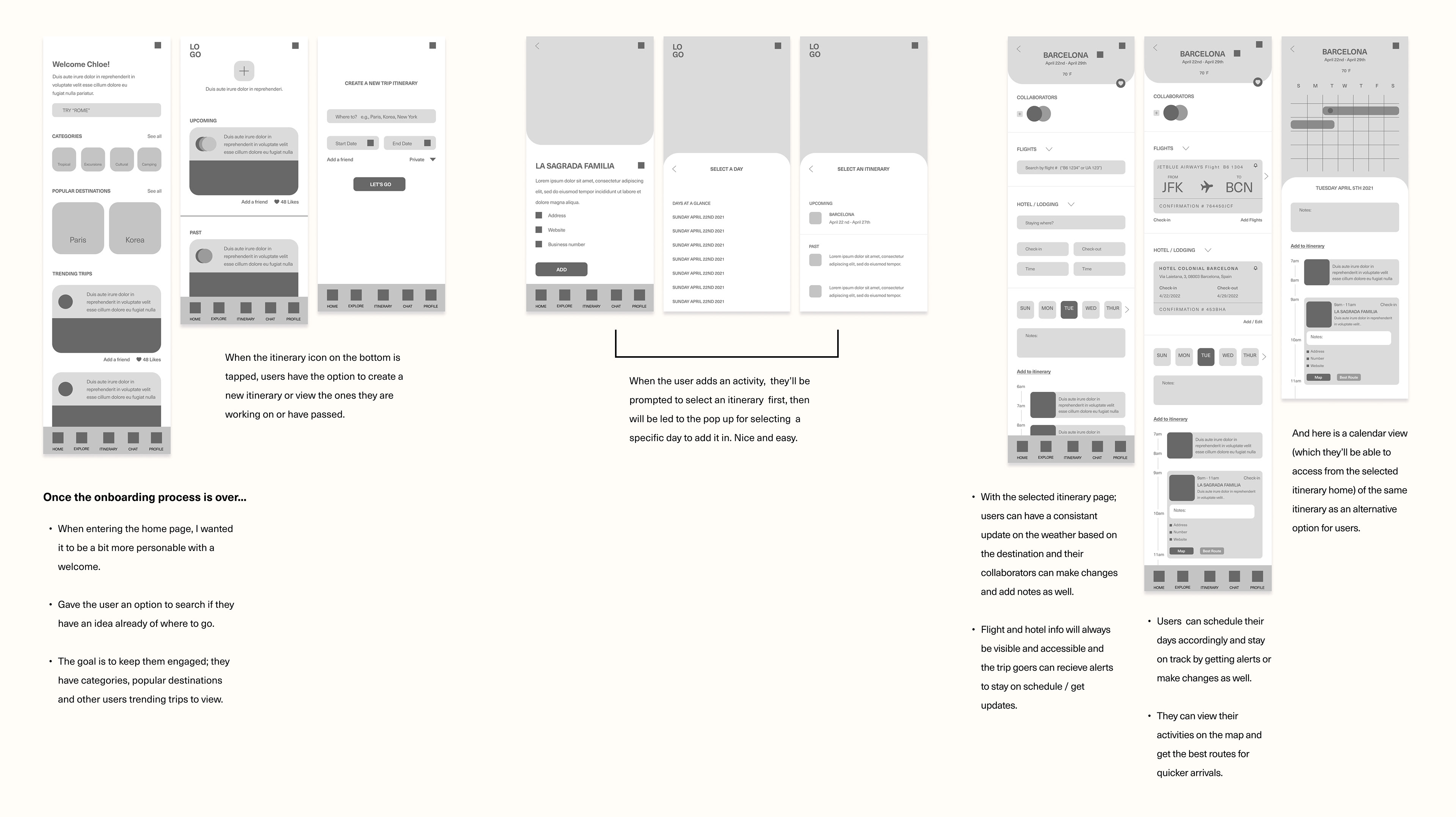 I wanted to focus on 5 main flows (onboarding, creating a new itinerary, adding an activity to your itinerary, navigating to add flight details and navigate to view calendar at a glance while in the itinerary) that will help users to navigate accordingly to build out their itinerary with ease.